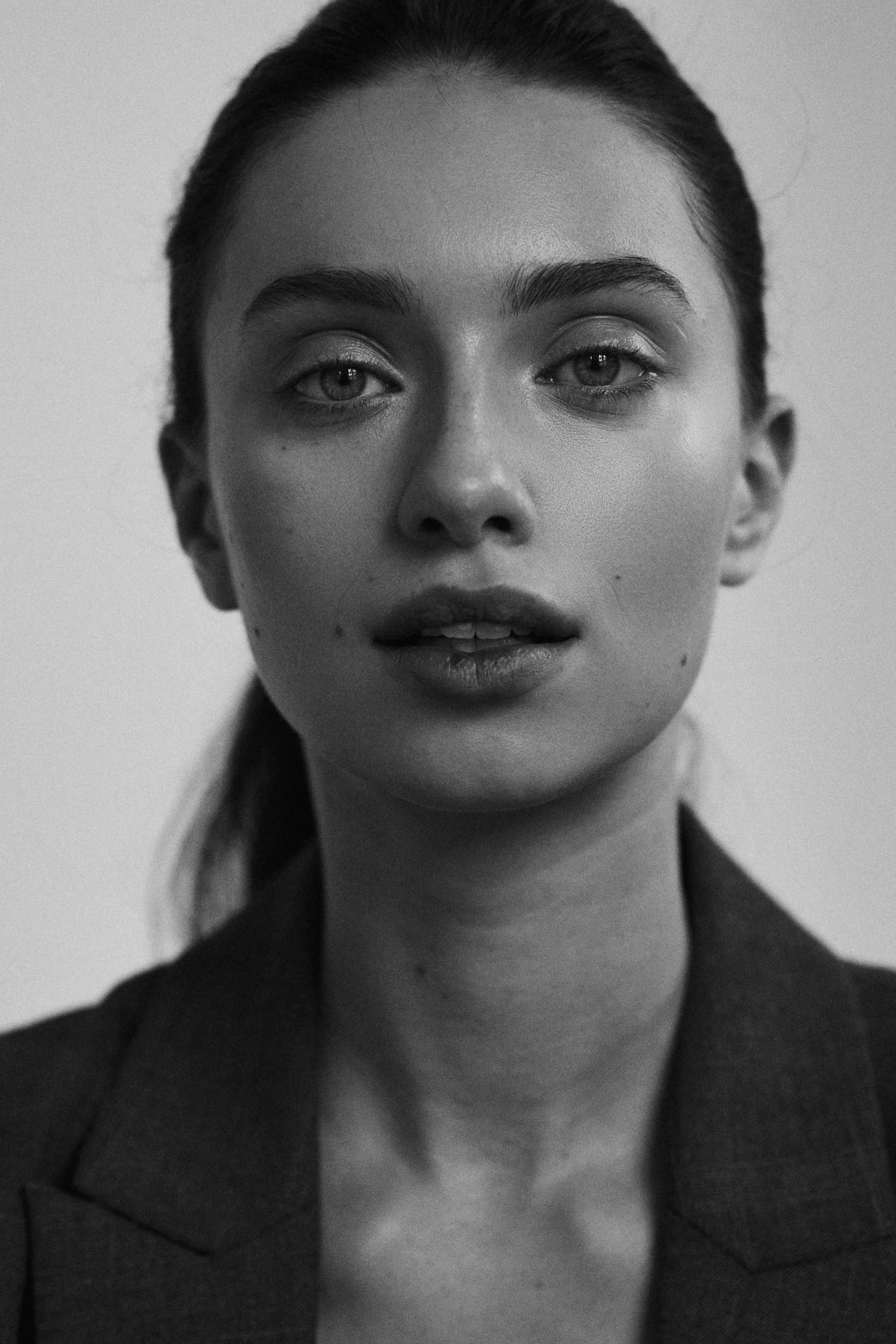 Moim absolutnym numerem jeden, który mam podpięty przez 95% czasu, jest Tamron 35–150 mm f/2–2.8. Jest mega uniwersalny. To fenomenalne szkło, bo w jednej sekundzie mogę zrobić szeroki kadr, na przykład całą sylwetkę, jeśli klient tego potrzebuje, a chwilę później przejść do detali. Czy to będzie beauty, zbliżenie na twarz i mimikę, czy malutki fragment ubrania, nie muszę tracić czasu na zmianę obiektywu. To jest dla mnie ogromna przewaga. Kocham go też za minimalną odległość ostrzenia. Przy 150 mm mogę zrobić super close-up, który normalnie wymagałby cropowania albo dodatkowego obiektywu makro. Tutaj mam pół twarzy w kadrze, naprawdę bardzo blisko. A ja lubię blisko. To są kadry, których innym sprzętem zwyczajnie się nie zrobi.