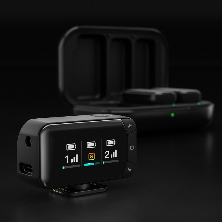 Rode Wireless Micro Camera Kit to te same mikrofony co wcześniej, ale tym razem wyposażone w nowy moduł odbiornika, przeznaczony do współpracy z aparatami i kamerami. Poza połączeniem USB-C otrzymujemy wiec też możliwość wpięcia się poprzez złącze mini Jack 3,5 mm. Odbiornik wyposażono tez w mały (ale dotykowy) ekranik AMOLED, pozwalający na monitorowanie poziomów audio i regulacje podstawowych ustawień.