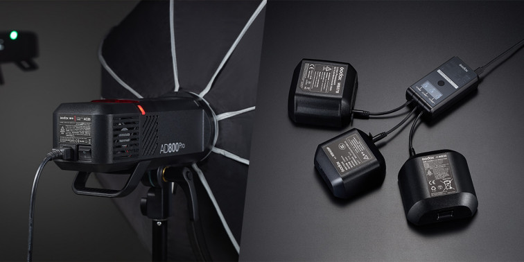 Godox AD800Pro może pracować zarówno na akumulatorze, jak i - przy użyciu opcjonalnego adaptera AC26 - bezpośrednio z sieci. Opcjonalna szybka ładowarka UC-46 skraca czas ładowania baterii do około 1,5 godziny.