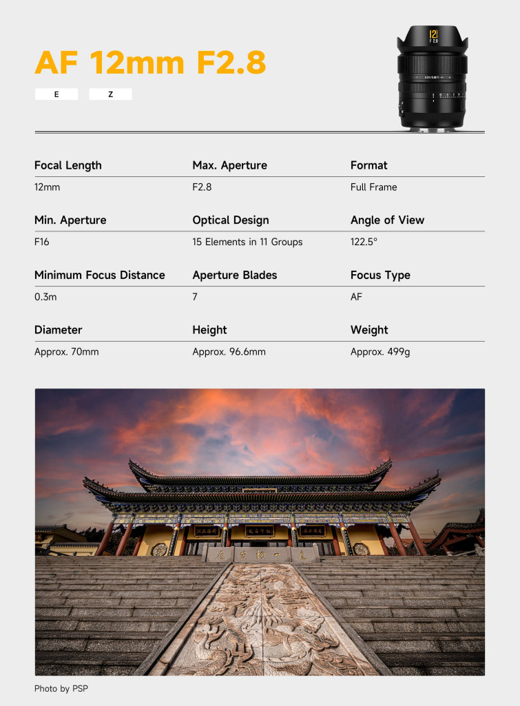 Do tej pory w serii szkieł z autofokusem ukazały się modele 85 mm f/1.8. 50 mm f/1.4, 35 mm f/1.8 i 24 mm f/1.8. Teraz producent idzie o krok dalej i otwiera swój katalog na pozycję superszerokątną, pokazując model Brightin Star AF 12 mm f/2.8, czyli „zmotoryzowaną” wersję manualnego modelu o tych samych parametrach, który cieszy się bardzo dobrymi opiniami użytkowników.
