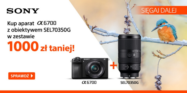 Osobna promocja obowiązuje na model Sony A6700. Każdy, kto do 1 lutego zakupi jednocześnie aparat oraz obiektyw Sony E 70-350 mm f/4.5-6.3 G OSS otrzyma rabat w wysokości 1000 zł. W promocja obowiązuje zarówno w przypadku zakupu samego body A6700, jak i zestawów z obiektywami.