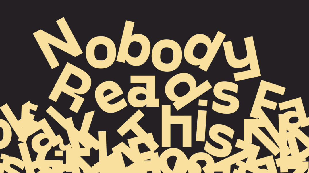Targi Nobody Reads This to wreszcie przestrzeń spotkania wydawców, projektantów, artystów - okazja do rozmowy i wymiany doświadczeń. W programie znajdą się spotkania oraz warsztaty ukierunkowane na rozwijanie umiejętności praktycznych i zachęcające do własnych wydawniczych eksperymentów.