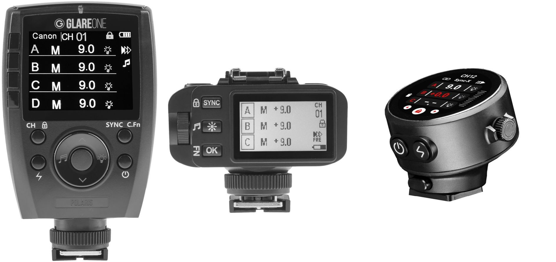 GlareOne Lynx, Polaris i Talos to nadajniki o zasięgu do 80 (Talos) lub 100 (Lynx, Polaris) metrów i częstotliwości 2.4 GHz, która zapewnia stabilną komunikację. Wspierają High-Speed Sync (HSS) do 1/8000 sekundy oraz obsługę TTL.