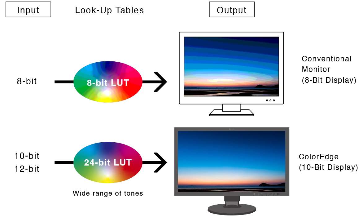 Kluczowa cechą tego monitora (zresztą i innych z serii CG) jest wzorowa reprodukcja barw zgodna z branżowymi standardami. Precyzyjne odtwarzanie kolorów w tym modelu zapewnia tabela 3D LUT. CG3100X może obsługiwać 10-bitowe wyświetlanie z 24-bitowej tablicy LUT, co przekłada się na możliwość jednoczesnego pokazania ponad miliarda kolorów (w przybliżeniu 64× więcej niż w typowych torach 8-bitowych). W rezultacie zyskujemy gładsze gradienty (mniejsze ryzyko bandingu) i mniejsze różnice postrzegane między sąsiadującymi odcieniami, co jest szczególnie ważne przy korekcji skóry, nieba, tła studyjnego czy miękkich przejść światło-cień.