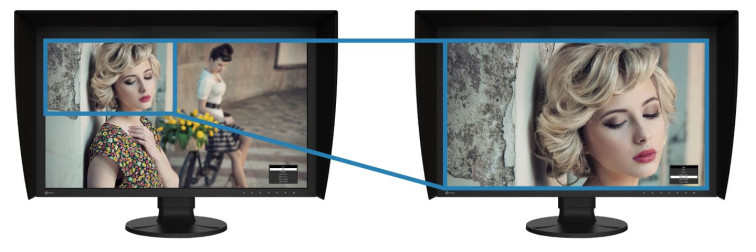 Bardzo ważną funkcją w tym monitorze, szczególnie ze względu na jego wielkość, jest kontrola jasności i odchyłek chromatyczności w różnych fragmentach matrycy. EIZO stosuje tu rozwiązanie DUE (Digital Uniformity Equalizer), którego zadaniem jest kompensacja takich wahań, tak aby obraz na całej powierzchni ekranu był możliwie jednolity. W praktyce jest to ważne np. przy ocenie winiety, gradientów, cieniowania tła czy plam barwnych.