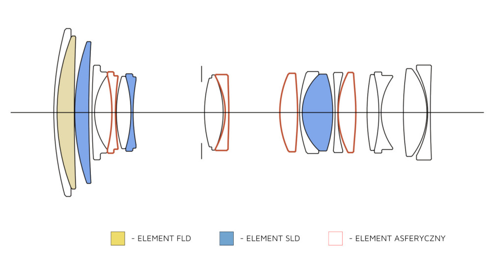Między grupy wpleciono całkiem sporo wysokiej jakości elementów specjalnych: wspomniane już asferyczne, które redukują dystorsję, oraz niskodyspersyjne (typu FLD/SLD), które minimalizują aberrację chromatyczną na kontrastowych krawędziach.