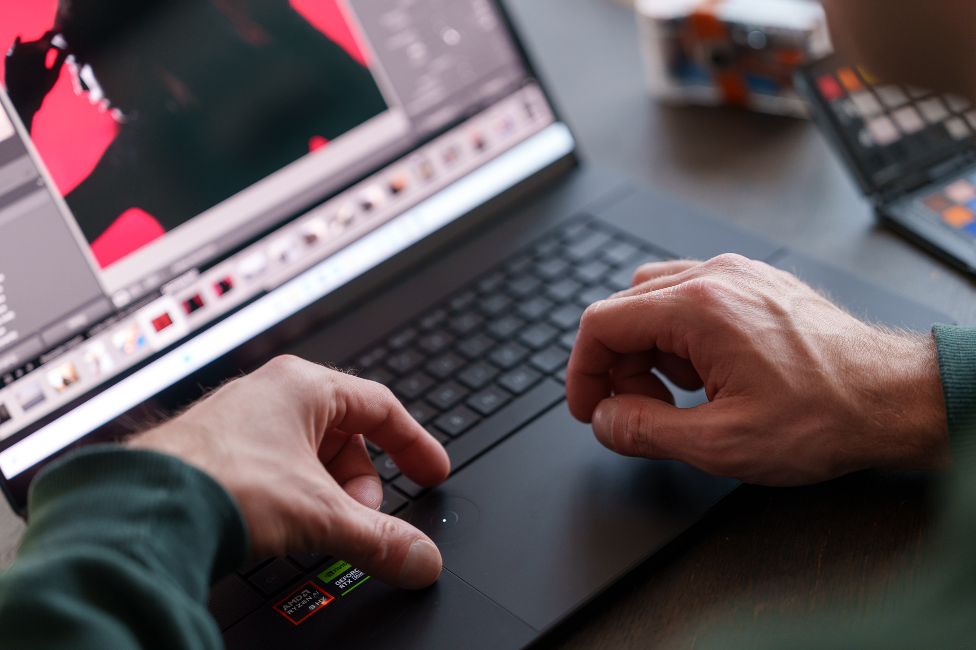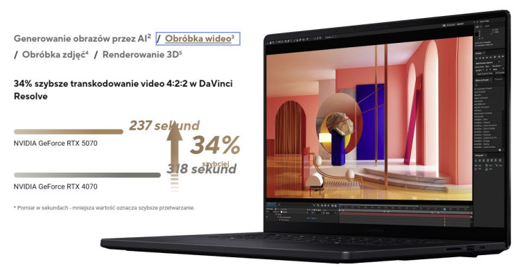 Kluczowa jest w niej karta graficzna GeForce RTX 5070 Laptop GPU, która - od i tak bardzo szybkiego procesora AMD Ryzen™ AI 9 HX 370 - przejmuje znaczną część obliczeń związanych z renderem, efektami, kodowaniem i dekodowaniem wideo oraz funkcjami AI. Dzięki temu procesor jest odciążony, podgląd w czasie rzeczywistym pozostaje stabilniejszy, a eksport krótszy, gwarantując jednocześnie swobodną wielowątkową pracę bez zadyszki.