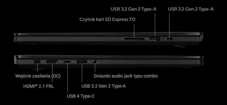 Łączność ze światem i peryferiami zapewnia z kolei stabilne i szybkie połączenie Wi-Fi 7, a także port USB4 Type-C 40 Gb/s do szybkiego ładowania i podłączania zewnętrznych monitorów, USB 3.2 Gen 2 Type-A, HDMI 2.1 FRL oraz czytnik SD Express 7.0 do szybkiego zgrywania materiału. Uzupełnieniem jest system 6 głośników z certyfikacją Harman Kardon oraz obsługa Dolby Atmos, co świetnie sprawdza się i w rozrywce, i przy wstępnej ocenie dźwięku w materiałach wideo.
