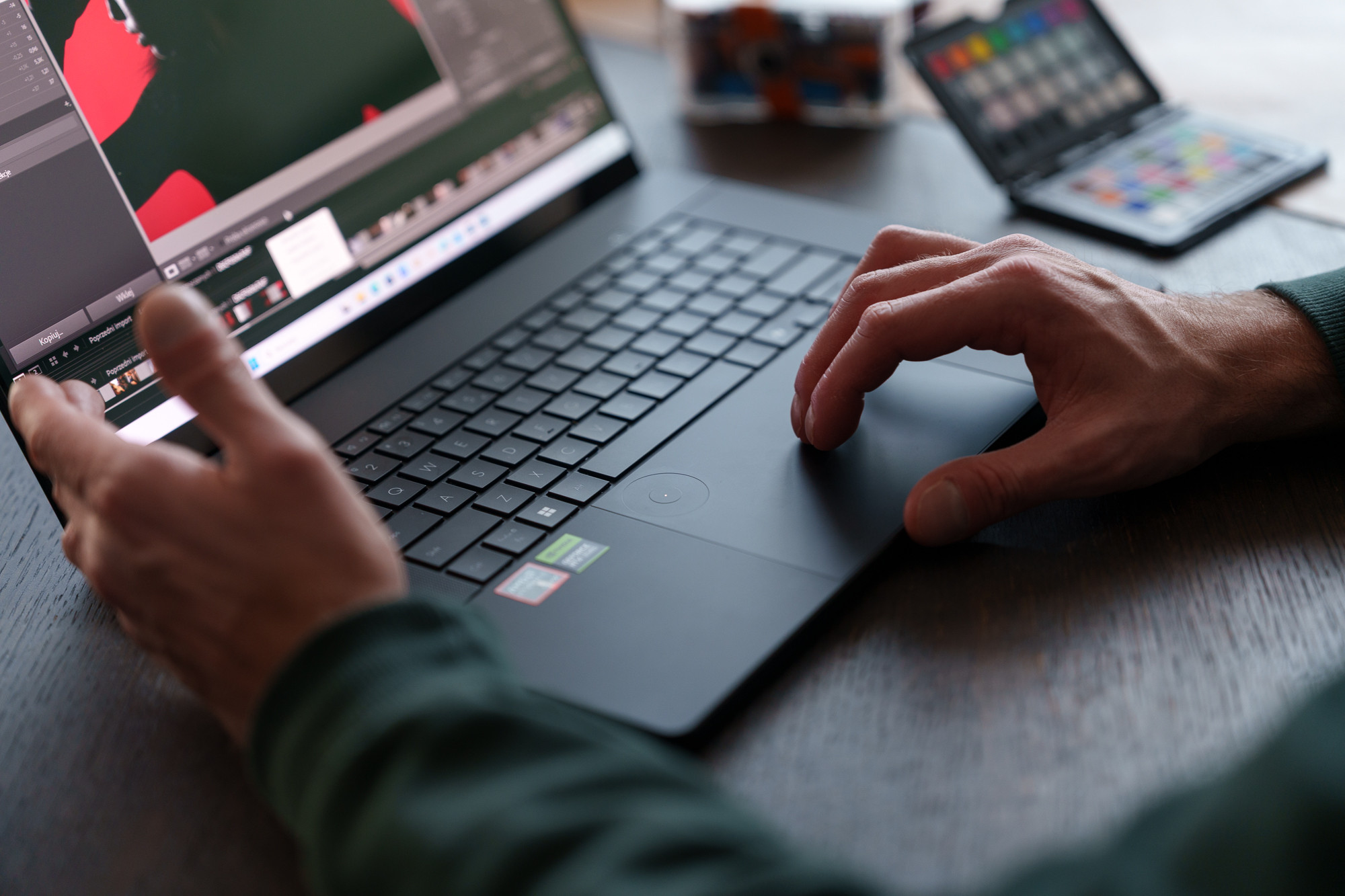 Wygodną obsługę wspiera dodatkowo innowacyjny ASUS DialPad. To wielofunkcyjne dotykowe “pokrętło” usytuowane na gładziku, które można łatwo konfigurować pod różne aplikacje, w tym Lightrooma i Photoshopa. Ten kontroler skraca drogę do najczęściej zmienianych ustawień - od rozmiaru pędzla po szybkie cofanie operacji – i umożliwia precyzyjną regulację bez odrywania uwagi od obrazu. W środowiskach takich jak retusz, ilustracja czy montaż to często przekłada się na bardziej płynny rytm pracy, zwłaszcza przy zadaniach wykonywanych setki razy dziennie.