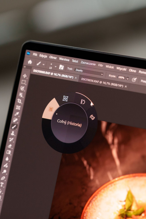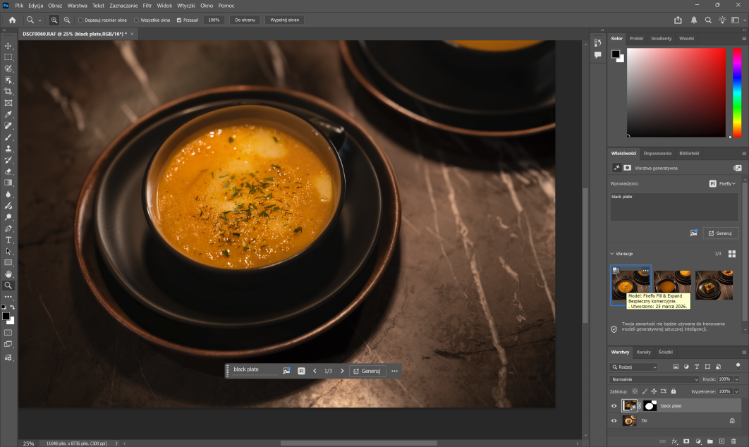 Tylko kilka sekund na tak dużym zdjęciu trwało wypełnienie generatywne - zastąpienie jednego talerza innym. Z kolei usunięcie tła z 60-megowego zdjęcia z A7R V zajęło 2-3 s, a wygenerowanie w tym miejscu nowego dodatkowe kilka-kilkanaście sekund. Przy takiej płynności działania, praca jest czystą przyjemnością.