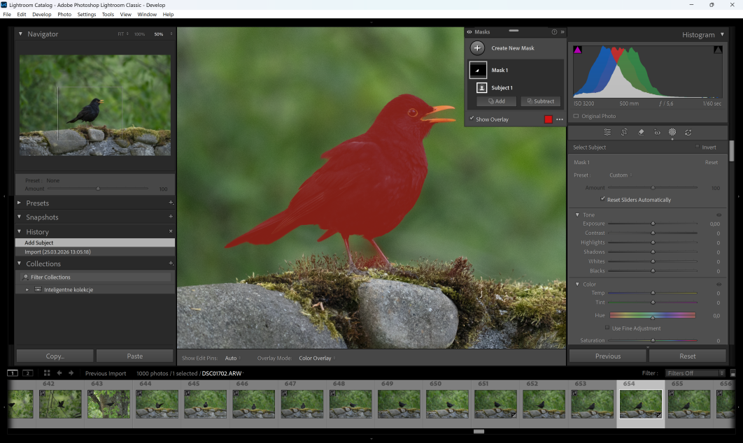 Pełny import 1000 zdjęć z R6 zajął mniej niż 3 minuty, a z A7R V około 5 minut - to naprawdę dobry wynik przy takiej ilości danych. Po tym czasie zdjęcia zostały całkowicie załadowane do Lightrooma. Przeglądanie ich, powiększanie 1:1, czy korekta na podstawowych suwakach odbywała się całkowicie płynnie i bez jakichkolwiek opóźnień. Na nic nie trzeba było czekać, a efekty zmian były widoczne od razu - nawet jeśli pracowaliśmy ze 100-megapikselowymi RAW-ami.