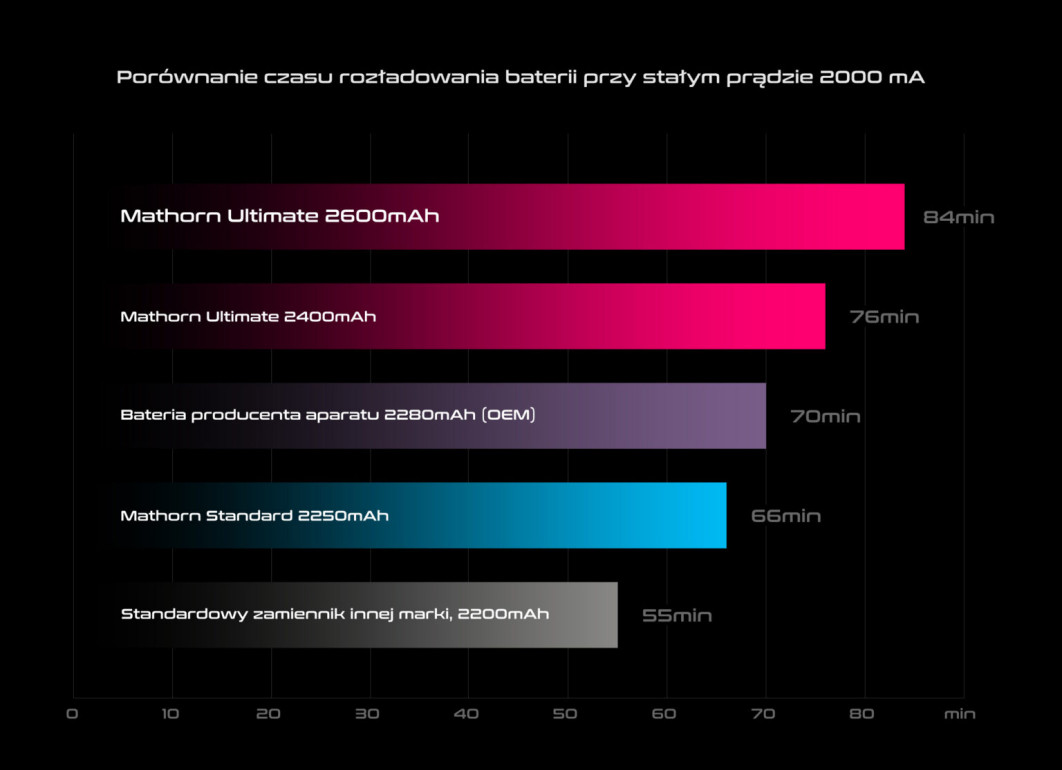 Jak widać na załączonym wykresie, także w teście laboratoryjnym baterie Mathorn osiągają bardzo dobre wyniki. Bateria Mathorn Ultimate 2600 mAh pracowała 84 minuty, a jej starsza wersja 2400 mAh przez 76 minut. Tymczasem bateria producenta aparatu (o pojemności 2280 mAh) rozładowała się po 70 minutach. Nawet podstawowy model Mathorn Standard 2250 mAh okazał się bardzo wydajny, niewiele ustępując baterii z aparatu. Najgorzej w zestawieniu wypadł zamiennik marki deklarującej pojemność 2200 mAh, który w rzeczywistości bazował na ogniwie 2040 mAh i rozładował się po 55 minutach.