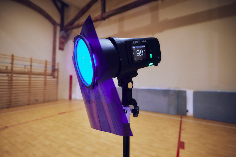 Światłem głównym był Botis 600 ze srebrnym parasolem ORB 110. Sam parasol świeci dość szeroko przyjemnym kontrastowym światłem. Kontry to dwa Botisy 400 wyposażone we wspomniane filtry. Bardzo doceniłem magnetyczne zatrzaski, bo dzięki nim nie musiałem przyklejać tych filtrów taśmą. Ważne jest, żeby lampy dawały podobną ilość światła, ale trzeba pamiętać, że różne filtry mają różną gęstość, co finalnie zaowocowało tym, że lampa z filtrem niebieskim pracowała o 1 EV mocniej niż ta z różowym.