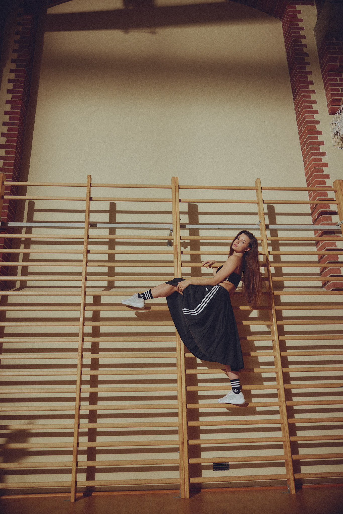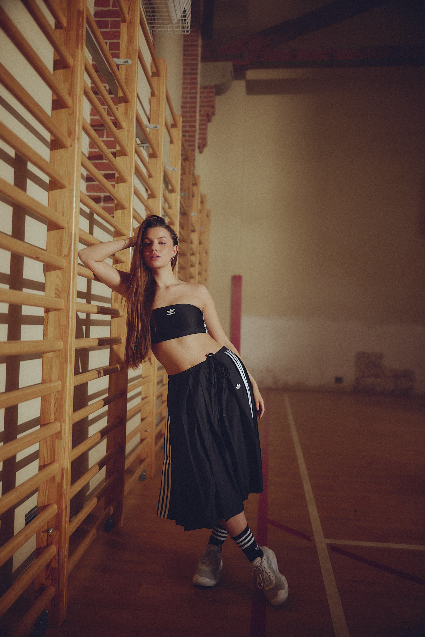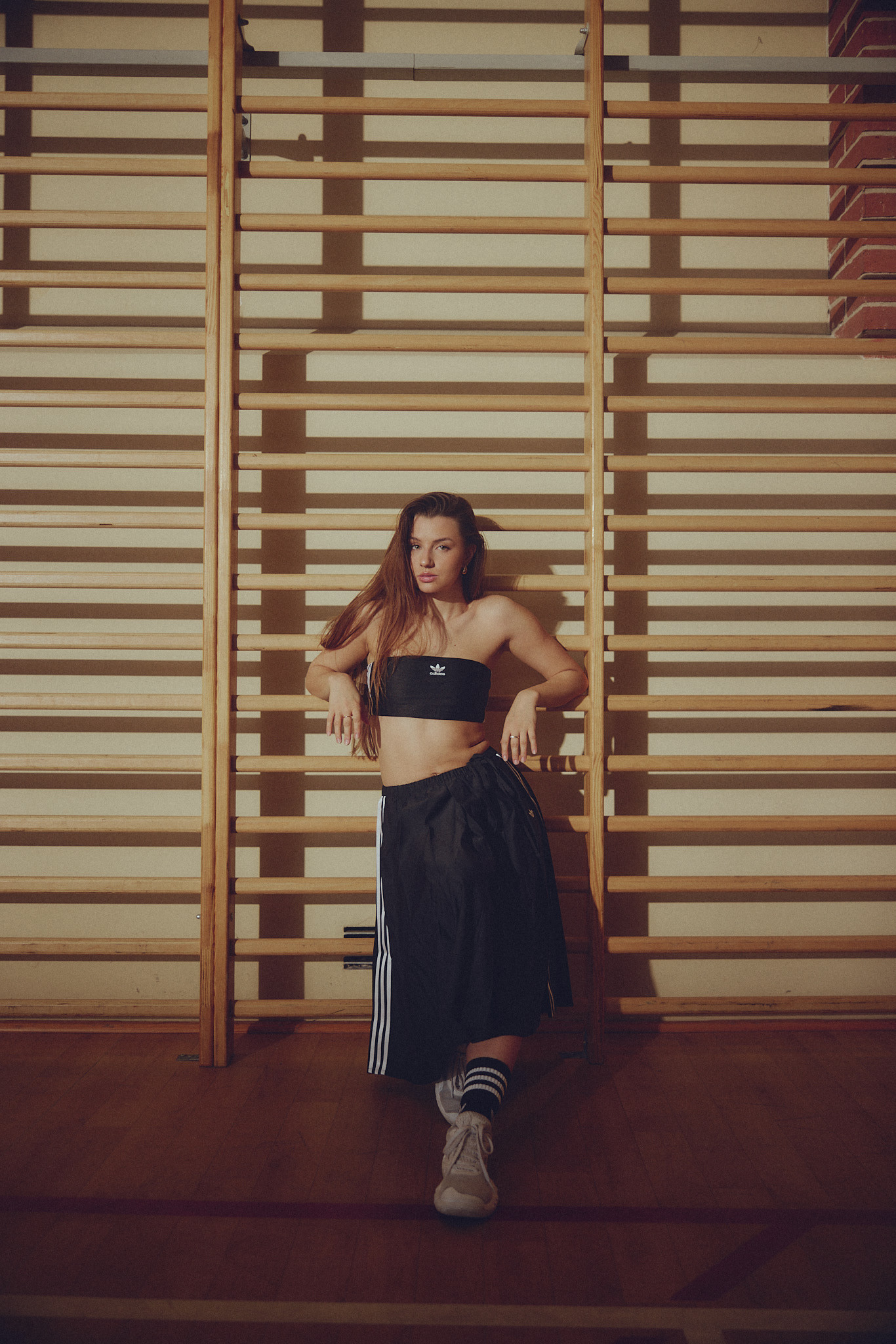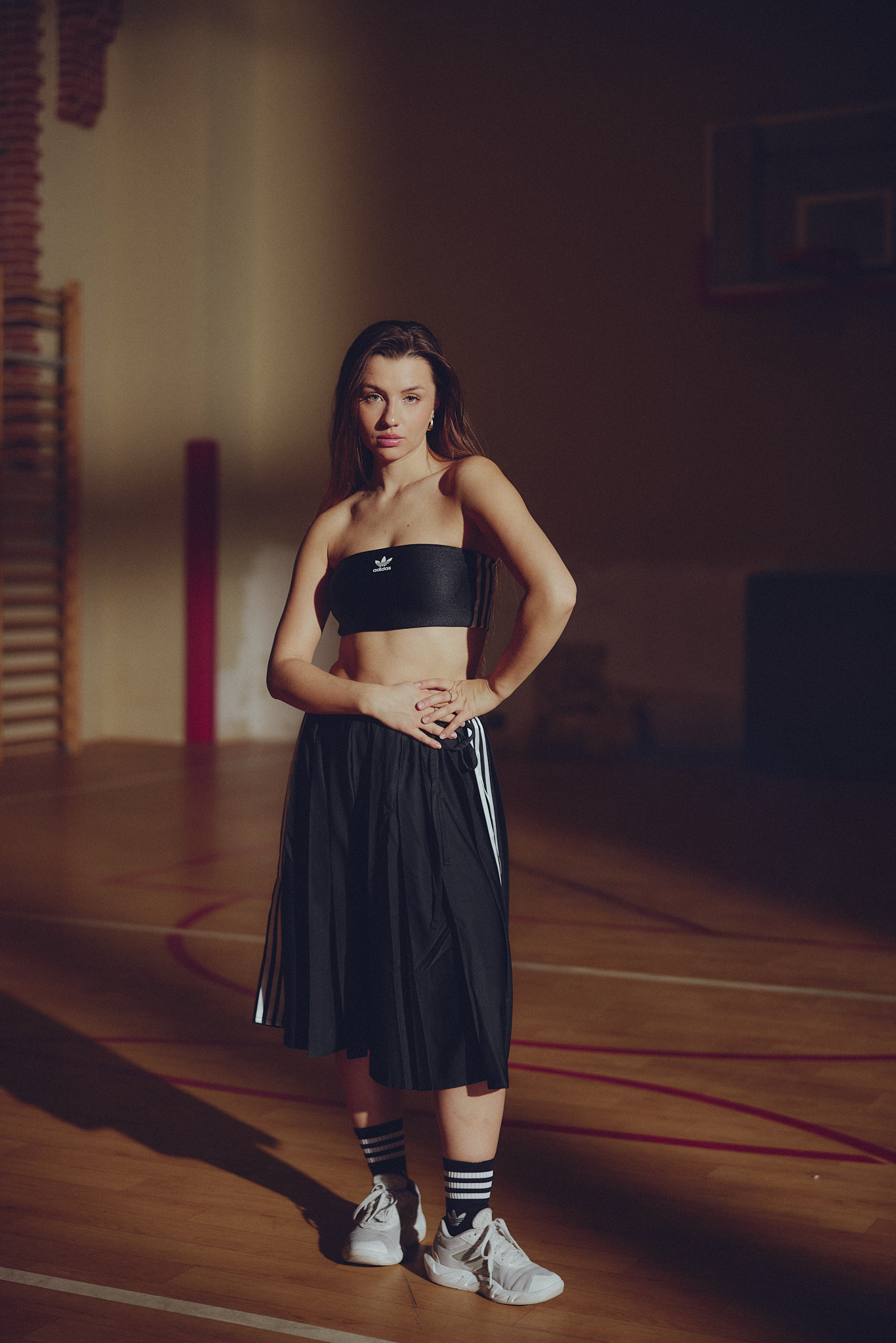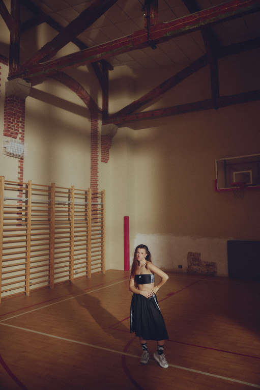 Tu starałem się już więcej popracować z różnymi kadrami, dlatego zrobiliśmy sporo zdjęć przy barierkach i na środku sali z barierkami w tle. W związku z tym, że lampa była daleko, intensywność światła była bardzo podobna niezależnie od tego, czy Olga była nieco bliżej, czy dalej okna (warto poczytać o zasadzie odwrotności kwadratów!). Olga ubrana była już w ostatnią stylizację, która podobnie jak poprzednie, łączy sport z modą.