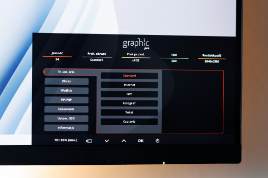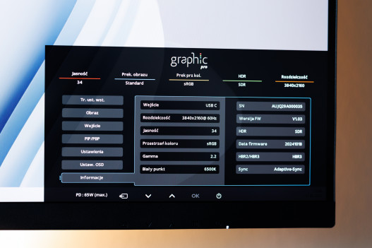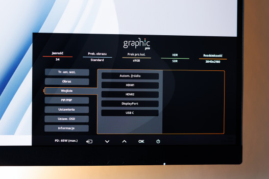 Dużym atutem tego monitora jest bogaty pakiet gniazd. Na spodzie do przesyłu sygnału wideo mamy aż cztery porty: 2x HDMI, 1x DisplayPort oraz 1x USB-C (PD 96W), który oczywiście pozwala na jednoczesne przesyłanie sygnału wideo, danych i zasilanie laptopa.