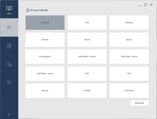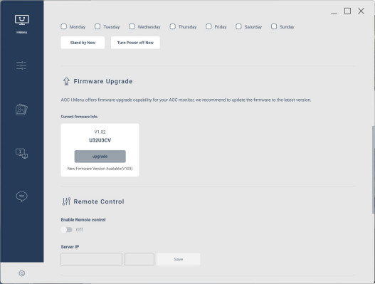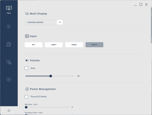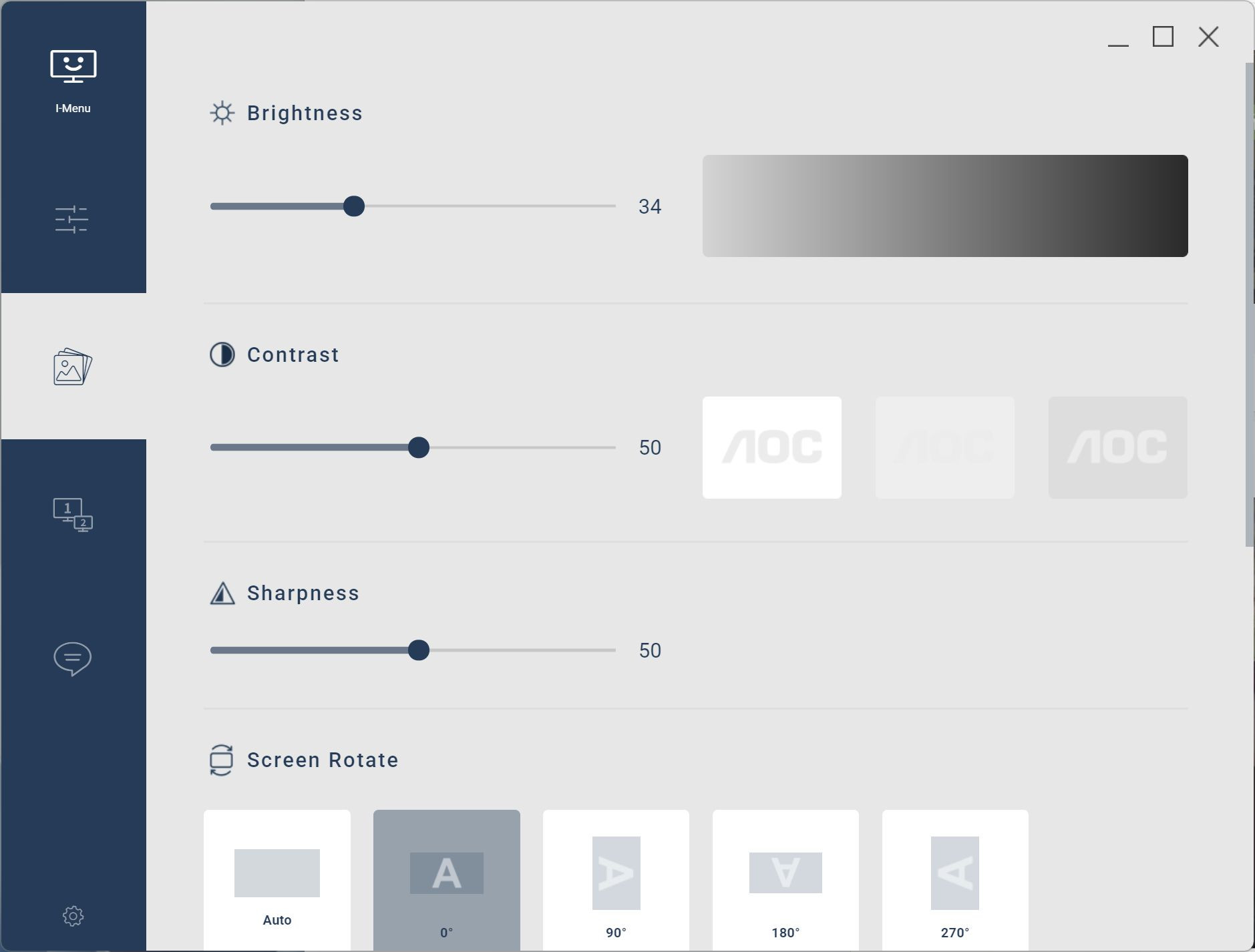 AOC udostępnia też darmowy program i-Menu. Dzięki niemu do większości ustawień monitora mamy łatwy i przejrzysty dostęp z poziomu myszki. W i-Menu możemy szybko przełączać się między trybami obrazu, suwakami regulować kontrast, jasność i ostrość, a nawet zaktualizować firmware monitora.