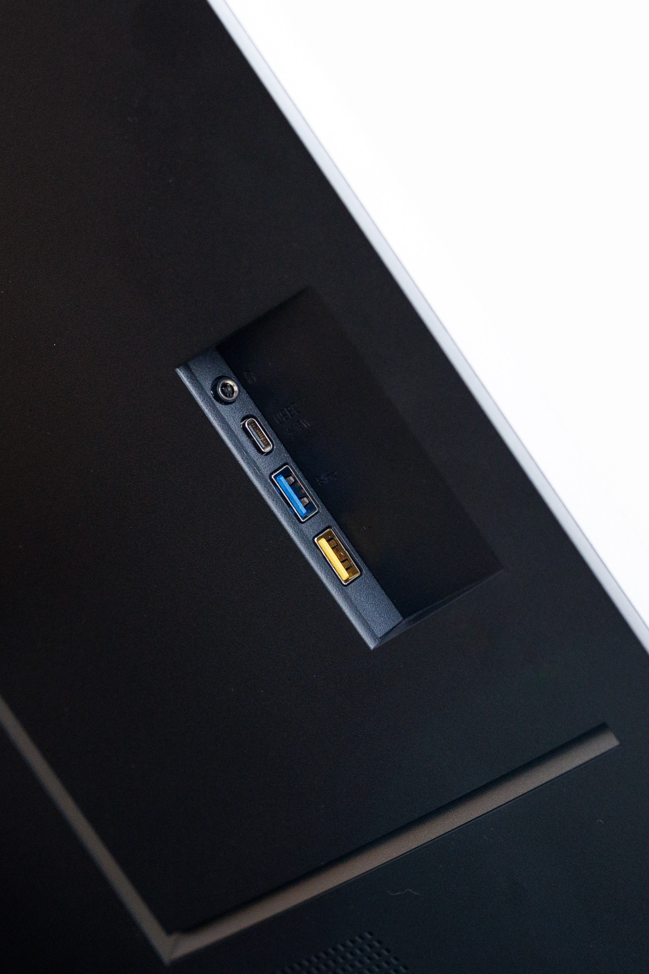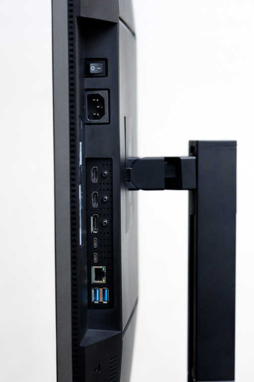 Dodatkowo na spodzie znajdziemy drugie gniazdo USB-C tylko do przesyłu danych, standardowe USB 3.2 Gen2 do pobierania danych (gdy monitor łączymy przed HDMI lub DP), wejście słuchawkowe oraz LAN - monitor można podłączyć do sieci i będzie działał jak zewnętrzna karta sieciowa. Do tego dochodzą z boku dwa gniazda USB 3.2 Gen2 (oba do przesyłu danych, w tym jedno z funkcją ładowania) oraz gniazdo USB-C z zasilaniem 15 W.