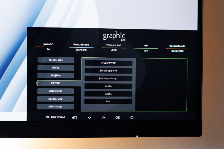 Oprócz funkcji KVM, z poziomu menu możemy także uruchomić tryb PIP/PBP, czyli wyświetlić jednocześnie na monitorze sygnały z dwóch komputerów - obok siebie lub obraz w obrazie.