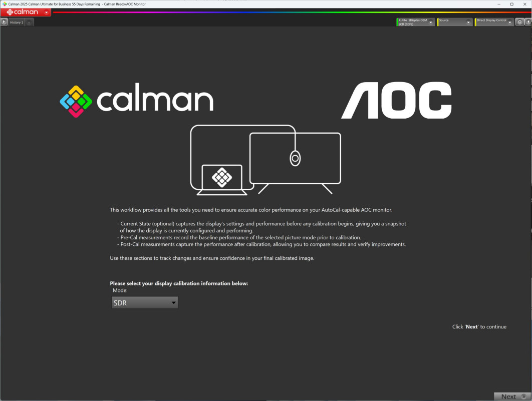Oczywiście z Calmanem można oswoić się prędzej czy później, tym bardziej, że producent na stronie przygotował klarowny instruktaż, jak skalibrować monitor AOC krok po kroku. Niestety w trakcie testów nie udało mi się do końca poprawnie skalibrować monitora sprzętowo ze względu na jakiś konflikt między laptopem, kolorymetrem i monitorem. Część wstępnych problemów z podłączeniem kolorymetru (Calibrite Display Pro HL) rozwiązała aktualizacja firmware'u samego monitora, ale na kolejnych etapach kalibracji i tak następowało zrywanie połączenia lub po prostu nieaktywna była funkcja regulacji jasności.