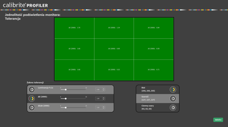 Przy jasności 100 cd/m2 błąd deltaE(2000) na całej powierzchni nie przekroczył poziomu 2. Mniej więcej ten sam poziom trzyma przy minimalnej jasności monitora (40 cd/m2) i tylko w jednym rogu przekroczył nieznacznie wartość 2 przy luminancji 200 cd/m2.