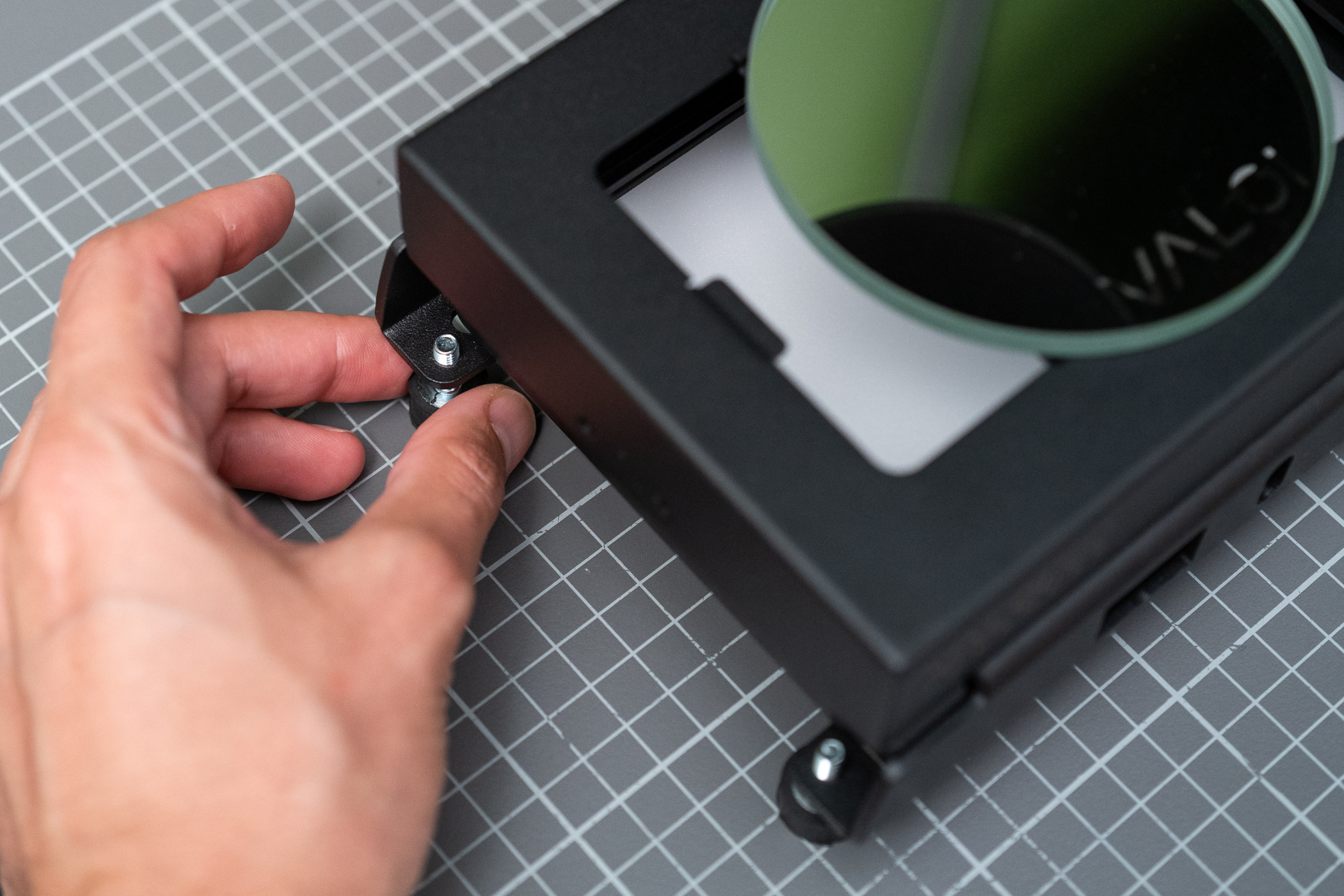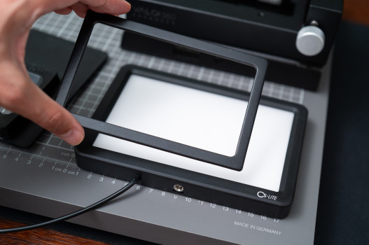 Do platformy wsuwamy panel LED i unieruchamiamy go wewnątrz plastikową zakrętką. Light Adapter stoi na czterech wkręcanych nogach, które służą do poziomowania całości i dodatkowo zapobiegają niechcianym przesunięciom. Adapter pozwala też unieruchomić ramkę filmu na górnej ściance, lub... postawić na niej kolejny moduł, który jeszcze odsunie negatyw od źródła światła i przyspieszy bezdotykowe skanowanie całej rolki.