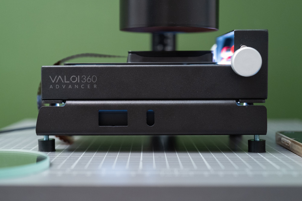 VALOI Advancer to moduł transportowy filmu, zaprojektowany tak, by umożliwić szybkie, precyzyjne i bezpieczne przesuwanie materiału pod obiektywem. Przypomina budową Light Adapter, ale nie włożymy do niego podświetlarki. Z założenia jest samodzielnym modułem, który ustawiamy na źródle światła – czy to opisywanej przed chwilą platformie Valoi czy też innym panelu LED - jeśli już taki posiadamy.