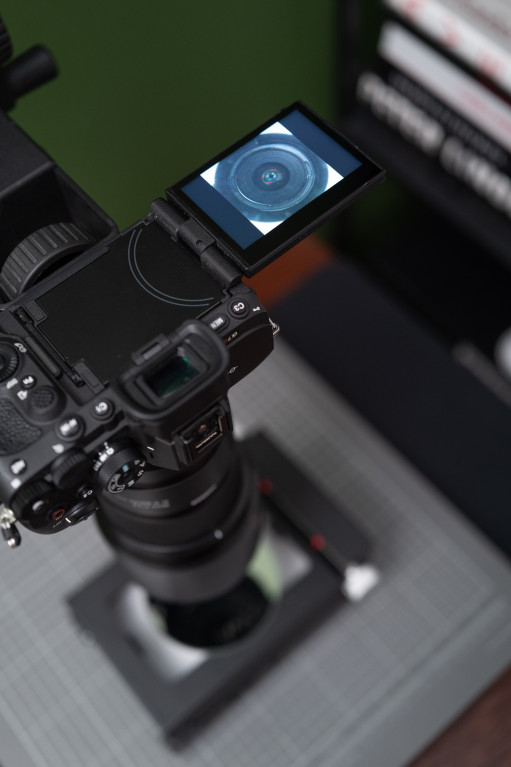 Wystarczy dołączone do zestawu (lub jakiekolwiek) niewielkie lusterko, które kładziemy na naszym module do skanowania i tak dopasowujemy pozycję aparatu, by ramka wypełniała kadr a środek widocznego w odbiciu obiektywu wypadał również na środku. Punktem odniesienia będzie zazwyczaj centralny punkt AF.