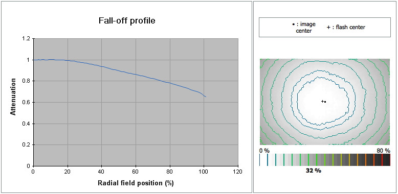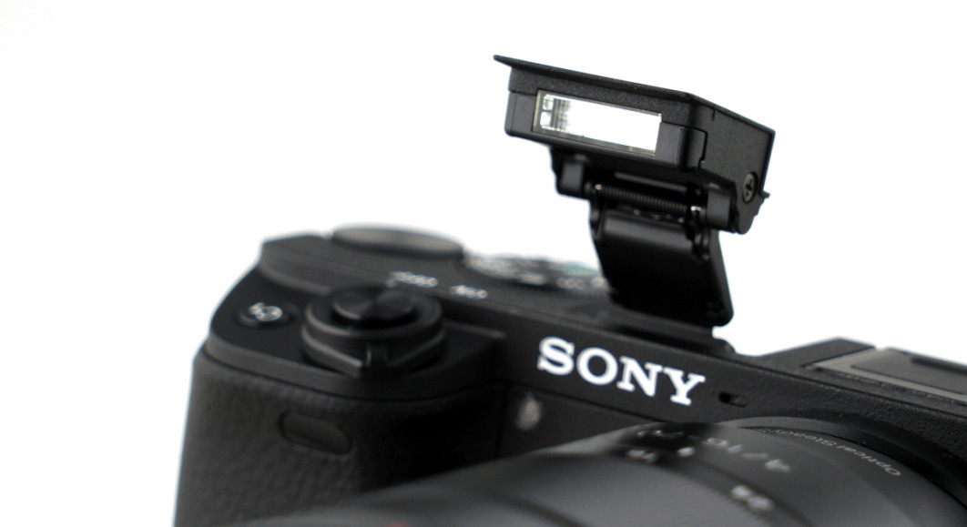 Aparat wyposażono we wbudowaną lampę błyskową, która choć bardzo niewielka to dysponuje całkiem dużą mocą. Jej zasięg to około 5 metrów. Flash bardzo dobrze wypada pod względem wypełnienia kadru światłem. Różnica w jasności między środkiem, a brzegami kadru wynosi jedynie 32%, dzięki czemu winietowanie będzie praktycznie niezauważalne. Jedynym problemem lampy jest to, że przestaje być ona funkcjonalna w przypadku większych obiektywów - na zdjęciach będzie uwidaczniał się ich cień.