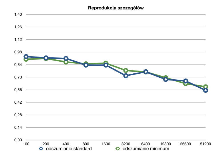 Poziom szumów i reprodukcja szczegółów mierzona jest dla plików JPEG w najwyższej, dostępnej rozdzielczości, dla najniższego ISO i ze standardowymi ustawieniami oraz dla najniższych ustawieniami odszumiania i wyostrzania. Pomiar wykonywany jest dla wszystkich dostępnych ekwiwalentów ISO co 1EV. Wykres przedstawia utratę szczegółów wraz ze wzrostem zaszumienia.