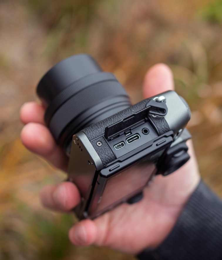 Dystans do bardziej filmowego X-M5, nowy X-T30 III utrzymuje także w temacie portów. Choć aparat umożliwia podłączenie zarówno mikrofonu, jak i słuchawek, konieczne są adaptery. Port mikrofonu jest tu w standardzie 2,5 mm (konieczna przejściówka z tradycyjnego 3,5 mm) a odsłuch możliwy jest poprzez przejściówkę na UBC-C.