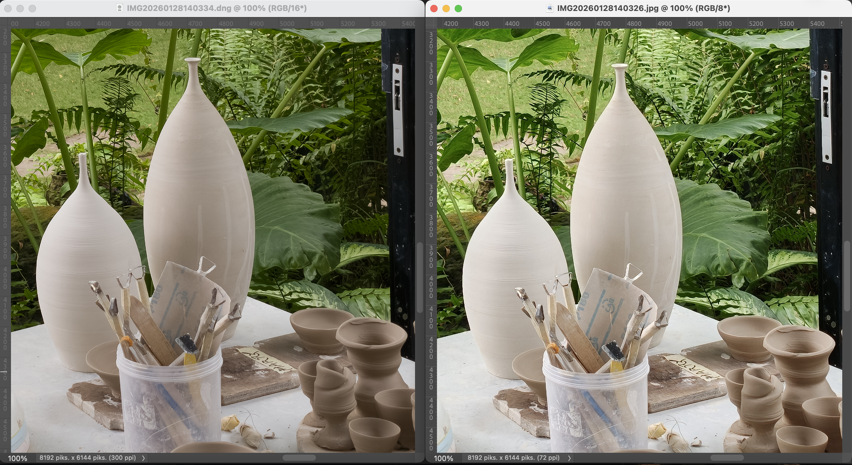 Porównując wywołany na domyślnych ustawieniach plik RAW i JPEG w trybie Auto, widzimy, że przetwarzanie sprowadza się w zasadzie do nieznacznego podbicia nasycenia i kontrastu, delikatnego uwydatnienia szczegółów i rozjaśnienia cieni. Nic, czego nie widzielibyśmy w przypadku większych aparatów systemowych czy zaawansowanych kompaktów.