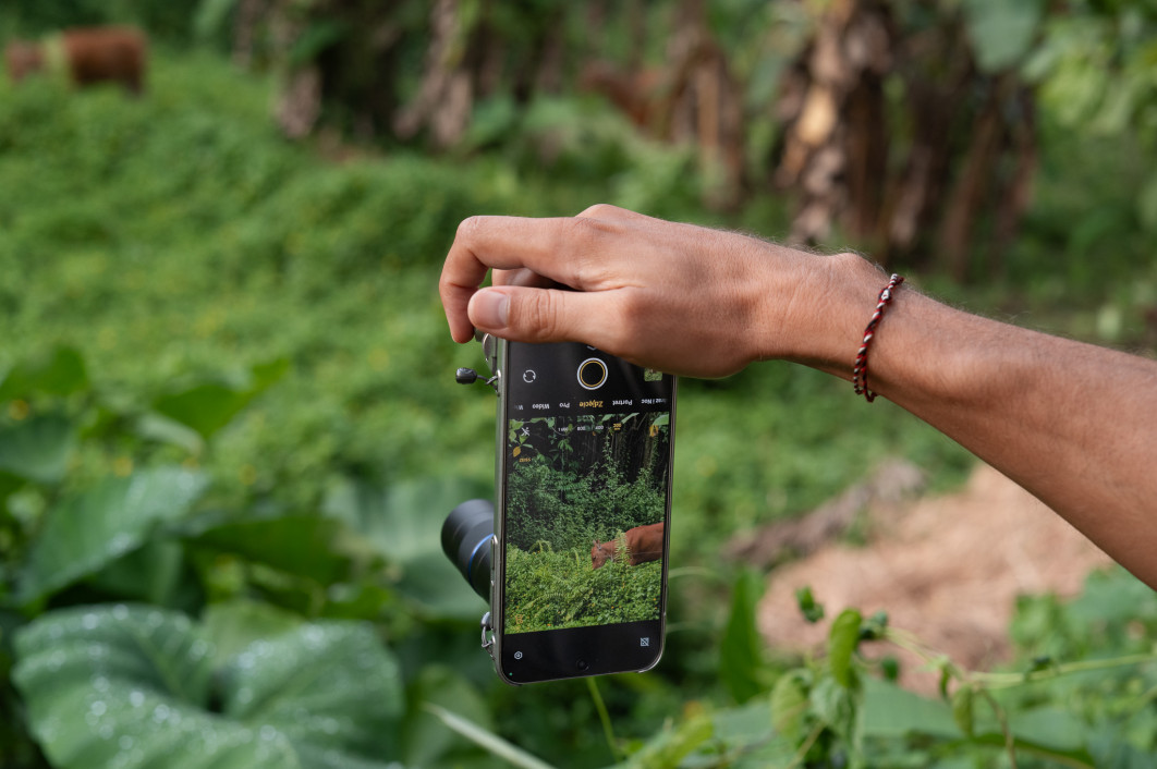 Ponieważ nie jest to klasyczny obiektyw (w precyzyjnym rozumieniu tego słowa), po podpięciu konwertera obraz jest odwrócony. Konieczne jest więc skorzystanie z dedykowanego trybu, który odwraca widok (ale też aktywuje stabilizację, bez której ciężko byłoby zapanować nad kadrem). Tryb teleobiektywu możemy uruchomić za pomocą ikony skrótu w głównym widoku. Szkoda, że smartfon nie rozpoznaje sam podpiętego konwertera.