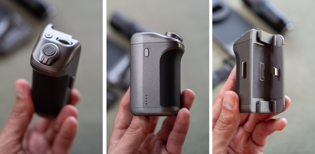 Ale najbardziej zaskoczył nas chyba dołączany grip, który jednym ruchem wsuwamy i blokujemy na obudowie. Komunikacja odbywa się przez złącze USB-C, pozwalając nam na kontrolę ekspozycji pokrętłem i wyzwalanie migawki klasycznym dwustopniowym spustem, który okala dźwignia zoomowania (a które niestety nie odbywa się płynnie). Jest też zaskakująco lekki, zwłaszcza biorąc pod uwagę fakt, że to jednocześnie nieduży powerbank 2300 mAh.