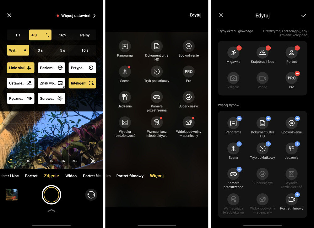 Warto tu zwrócić uwagę na kilka rzeczy. Domyślnie tryb kolorystyczny ustawiony jest na Vivid, który będzie wyraźnie podbijał nasycenie barw. Jako wyjściowy do własnej edycji lepiej sprawdza się z pewnością neutralny profil Zeiss, opracowany wspólnie z partnerem fotograficznym Vivo.