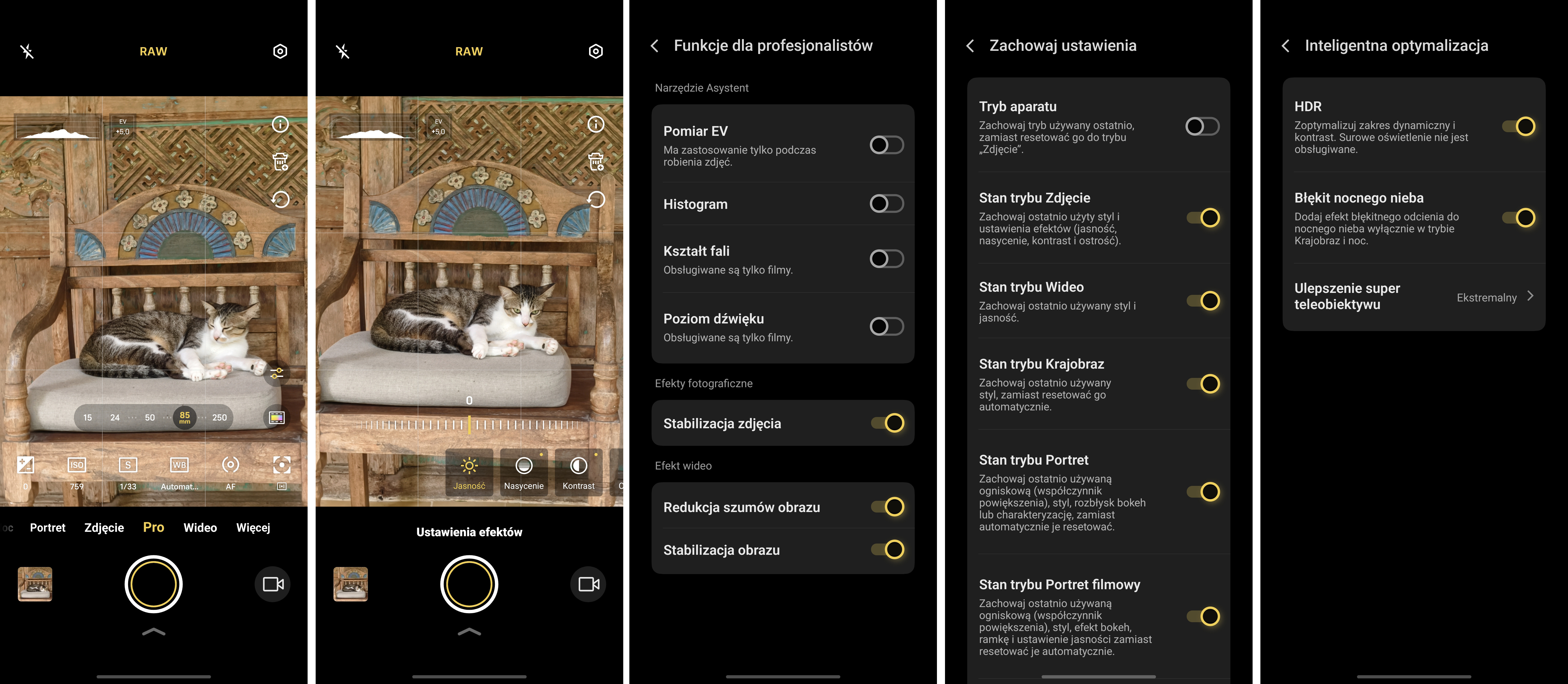 Dla bardziej wymagających użytkowników przygotowano tryb PRO, w którym nadal możemy korzystać z automatyki i formatu JPEG, ale już z nieco większą kontrolą nad ogólnym wyglądem obrazu. Możemy więc wybrać neutralny tryb Zeiss, ale lekko podbić nasycenie, obniżając jednocześnie kontrast i wyostrzenie. Aparat – jeśli tego chcemy – zapamięta nasze wybory i przywoła je za każdym razem, gdy uruchamiamy aparat. Nie jesteśmy więc skazani na cukierkowe zdjęcia w trybie Auto.