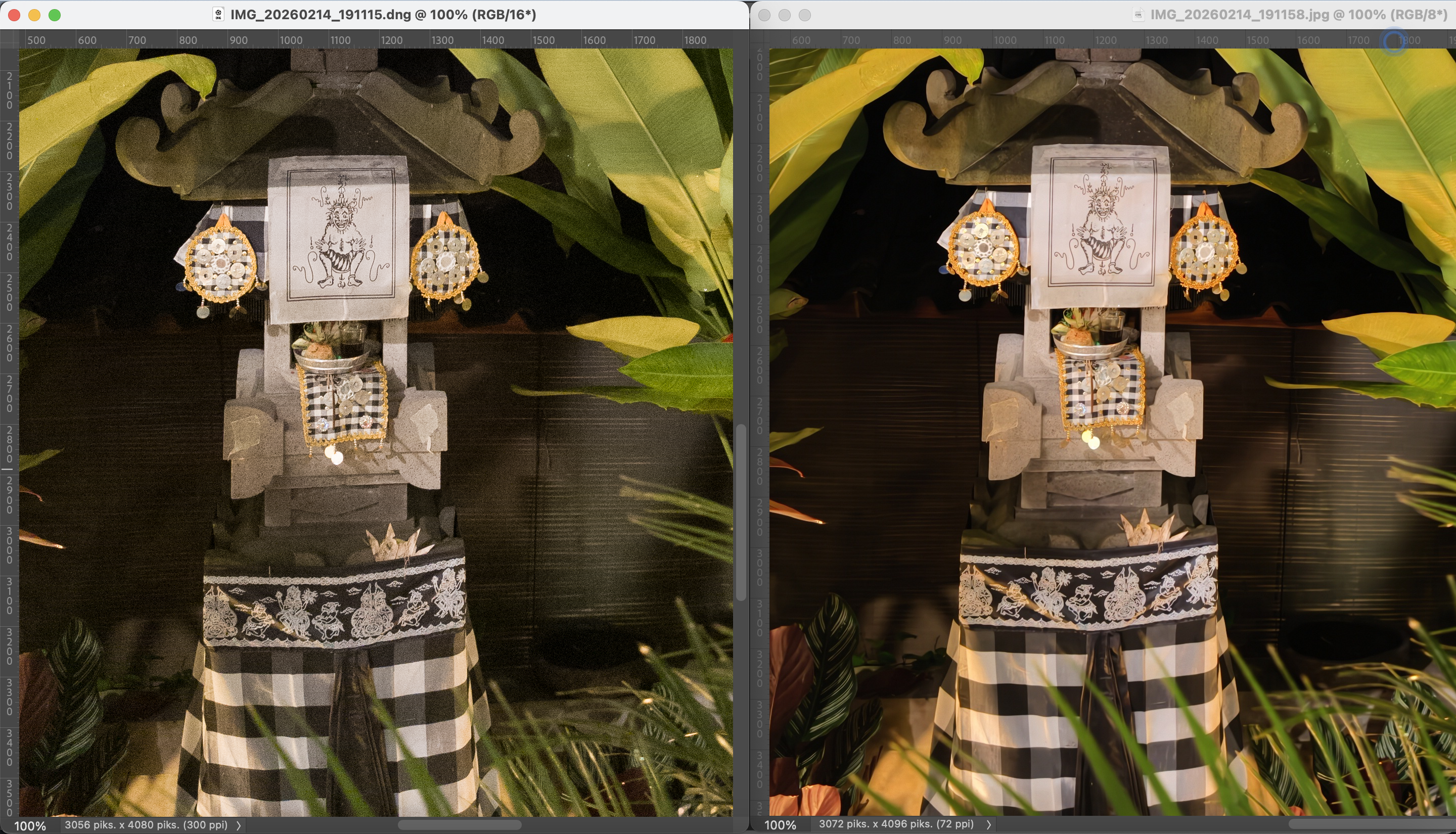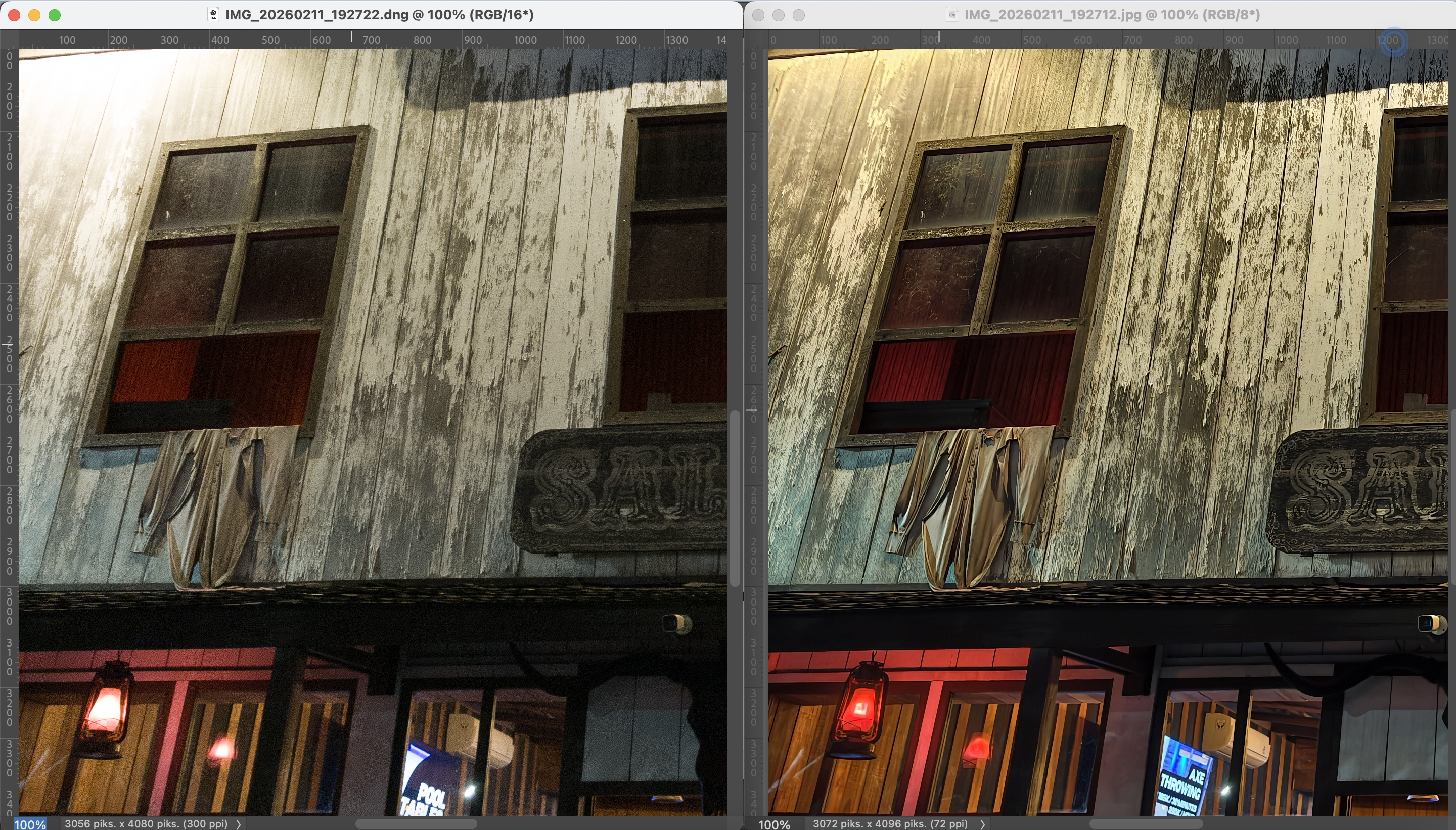 Zdjęcia nocne są gładkie, ale nadal zaskakująco szczegółowe, a tekstury nie zamieniają się w „plastelinę”. Dobrze pokazują to zresztą pliki RAW, które, co było dla nas zaskoczeniem, nie różnią się aż tak bardzo od wynikowych JPEG. Poniżej znajdziecie porównanie wycinków JPEG i RAW (wywołane w Lightroomie na ustawieniach domyślnych).