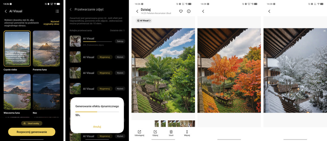 Lista trybów, funkcji i wariantów tych funkcji jest oczywiście bardzo długa, a narzędziom napędzanym przez AI moglibyśmy poświęcić osobny artykuł. AI Erase umożliwia usuwanie niechcianych elementów z tła a AI One-Shot Multi-Crop potrafi automatycznie wyciąć kilka różnych kadrów z jednego ujęcia (może się przydać, gdy przygotowujemy zdjęcie pod różne proporcje i platformy). Są też funkcje bardziej „kreatywne”, jak AI Landscape Master. I to już jazda bez trzymanki - „AI-owe” szaleństwo, pozwalające zmieniać nastrój sceny, porę dnia, a nawet porę roku.