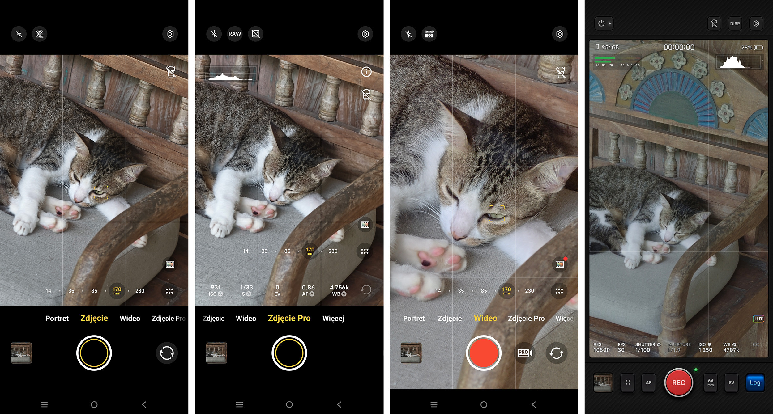 Największą zmianą jest nowy, rozbudowany tryb Pro Video, gdzie interfejs przypomina raczej te znane z profesjonalnych kamer niż smartfonów. Otrzymujemy waveform i histogram w czasie rzeczywistym, ręczną kontrolę parametrów, a przyciskiem DISP możemy wyczyścić kadr z większości overlayów, żeby lepiej oceniać obraz.
