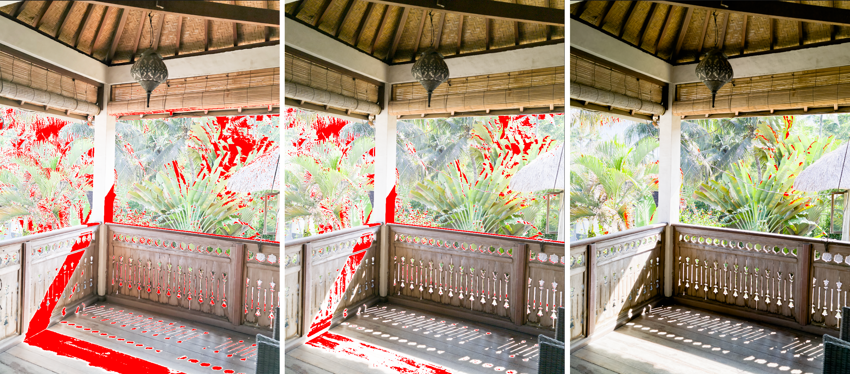 Na powyższym porównaniu widzimy efekt podniesienia ekspozycji o 2 EV. Czerwone plamy to obszary pozbawione informacji. Żadnego zaskoczenia: plik JPEG nie daje nam zbyt wiele pola do edycji. W przypadku pliku RAW rozjaśnianie cieni znacznie wolniej będzie prowadzić do równoczesnego przepalania świateł. Jeszcze lepiej wypada SuperRAW, a więc plik DNG sklejony z kilku surowych klatek o różnej ekspozycji. W praktyce będzie to najlepszy wybór w sytuacjach bardzo dużego kontrastu.