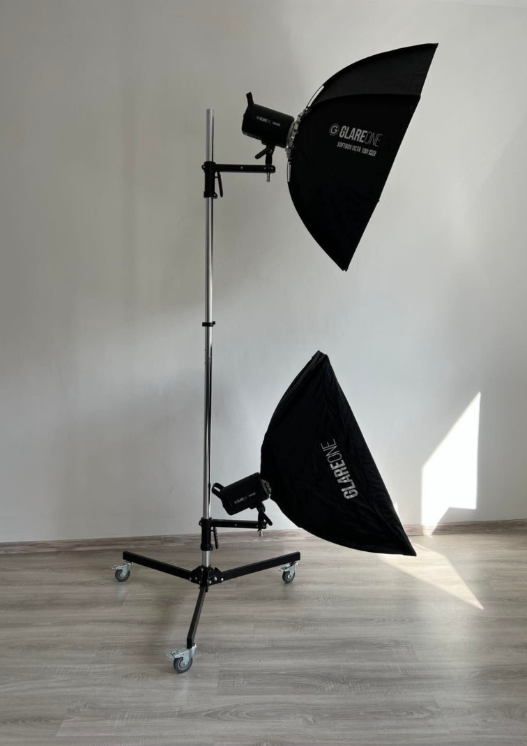 Dwie z lamp - GlareOne LED 300 Bi-Color D - posłużyły jako światło wypełniające. Zamontowałem na nich softboxy PRO o średnicy 100 cm. Ich zadaniem było delikatne rozświetlenie całej przestrzeni i zbudowanie miękkiej bazy, która łagodziła cienie i pozwalała uzyskać równą, estetyczną ekspozycję.
