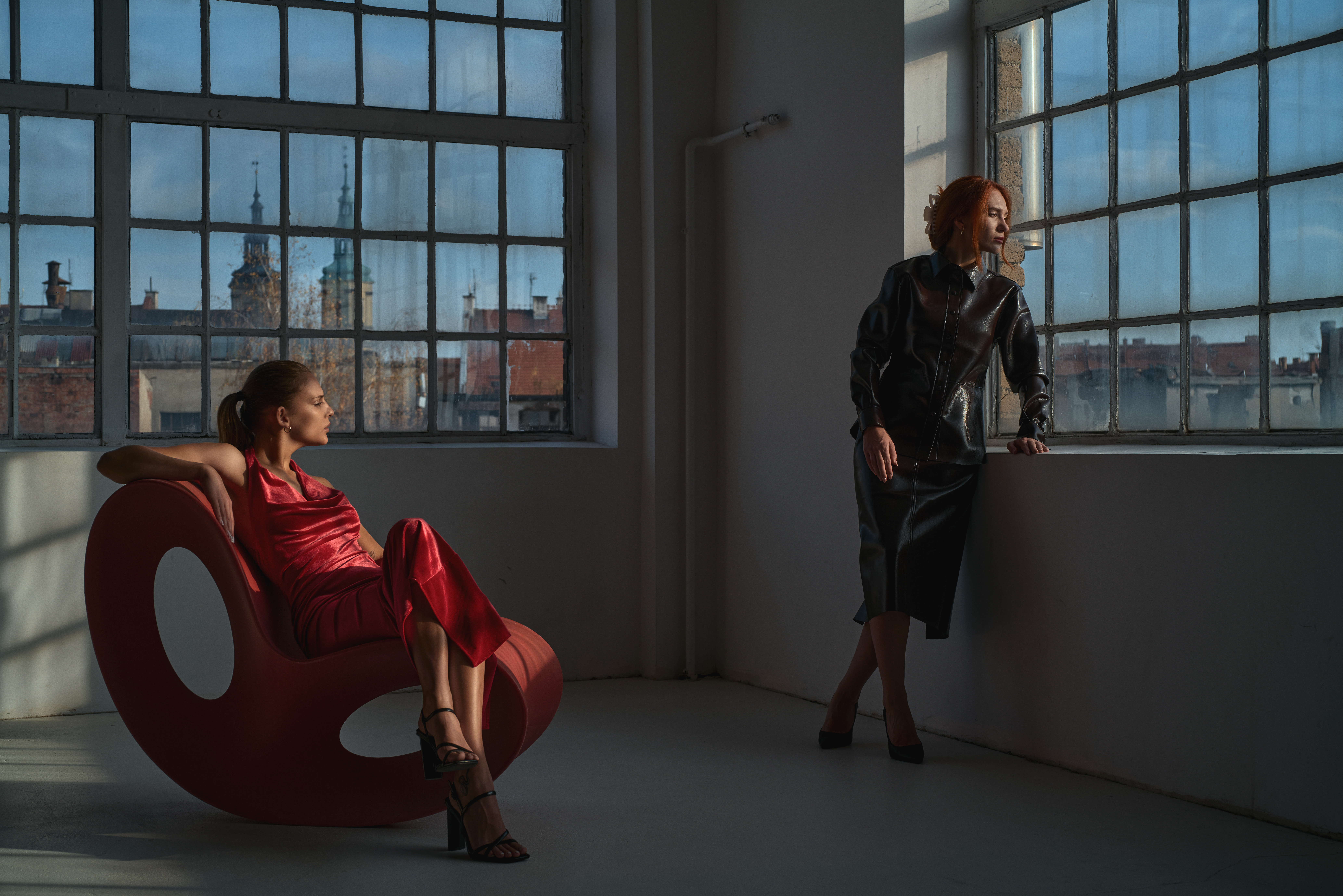Podczas warsztatów fotograficznych w Legnicy (Studio Kominka 22) mieliśmy do dyspozycji przestronne, ale mocno nasłonecznione pomieszczenie z dużymi oknami. Światło dzienne wpadało intensywnie z jednej strony, tworząc silny kontrast i prześwietlenia na twarzach modelek. Zamiast je wycinać czy ograniczać, postanowiłem je świadomie zbalansować, wypełniając drugą stronę kadru światłem ciągłym LED.