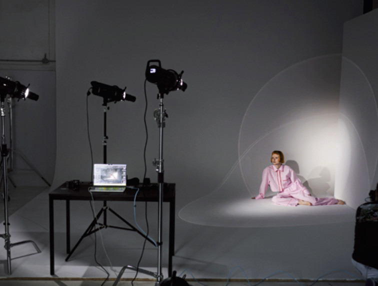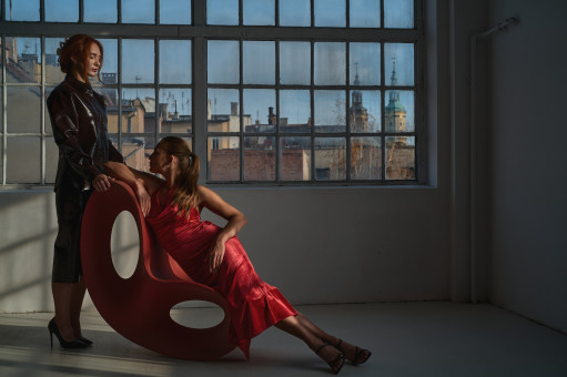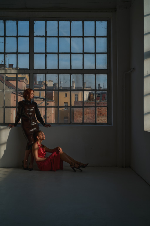 Użyłem dwóch lamp GlareOne LED 300 Bi-Color D z zamontowanymi czaszami. Ustawiłem je po dwóch stronach pomieszczenia, kierując strumień światła na sufit, tak aby delikatnie odbite światło wypełniło przestrzeń i zrównoważyło cienie. Dzięki tej technice światło nie było bezpośrednie ani agresywne - działało jak naturalne światło odbite, miękko otulające modelki, a ja mogłem ustawić poprawnie ekspozycję w aparacie na światło dzienne i poprawnie zarejestrować obraz.