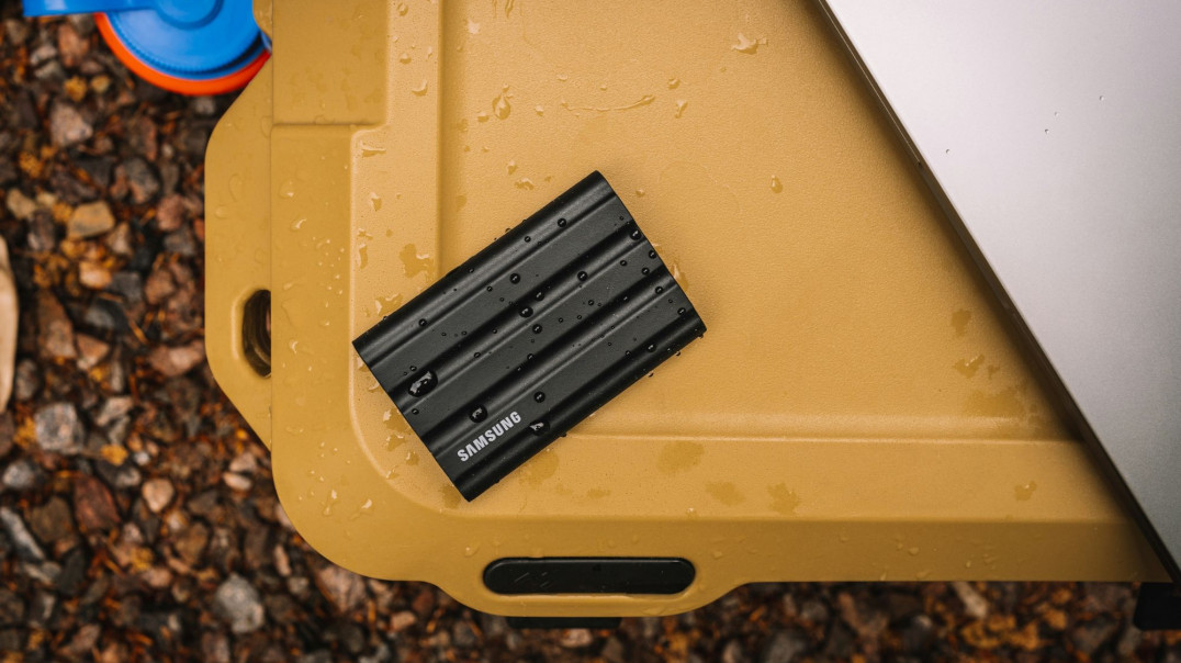 Pewne wybory sprzętowe ułatwiają życie w zimie, dlatego warto wskazać konkretne modele. Przy pracy w terenie najbardziej „bezstresowy” będzie Samsung Portable SSD T7 Shield. Ma uszczelnioną, gumowaną obudowę z klasą IP65 (odporną na pył i strumień wody)1 oraz deklarowaną odporność na upadek do 3 m2. Transfery do ok. 1050 MB/s (odczyt) i 1000 MB/s (zapis) przez USB-C (USB 3.2 Gen 2) wystarczą do szybkiego zgrywania RAW-ów czy materiału 4K w terenie. Do tego T7 Shield oferuje sprzętowe szyfrowanie AES 256-bit i ochronę hasłem. W praktyce oznacza to, że nawet przy pracy bezpośrednio z plecaka masz zarówno szybkość, jak i realną odporność na niesprzyjającą aurę.