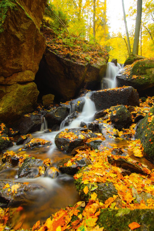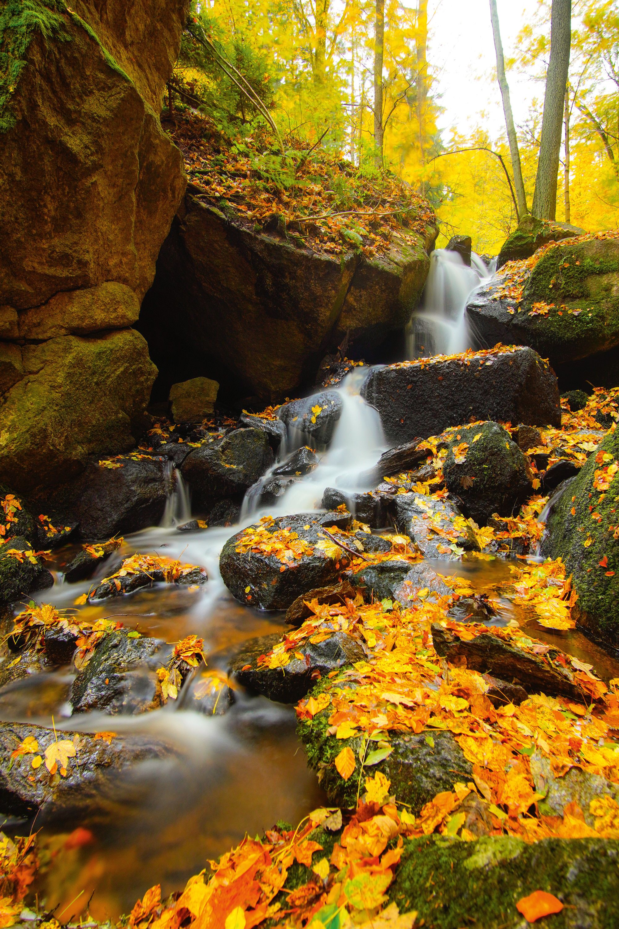 Wodospady świetnie fotografuje się przez cały rok, ale jesienią dochodzi bonus: spektakularne barwy drzew i stosy liści, idealne do zbliżeń przy mniejszych, leśnych kaskadach. Jeśli nie chcesz specjalnie „zamrozić” ruchu wody krótkim czasem migawki, zabierz statyw – to on pozwoli zrobić klasyczne, długie naświetlanie z miękką, kremowo rozmytą wodą.