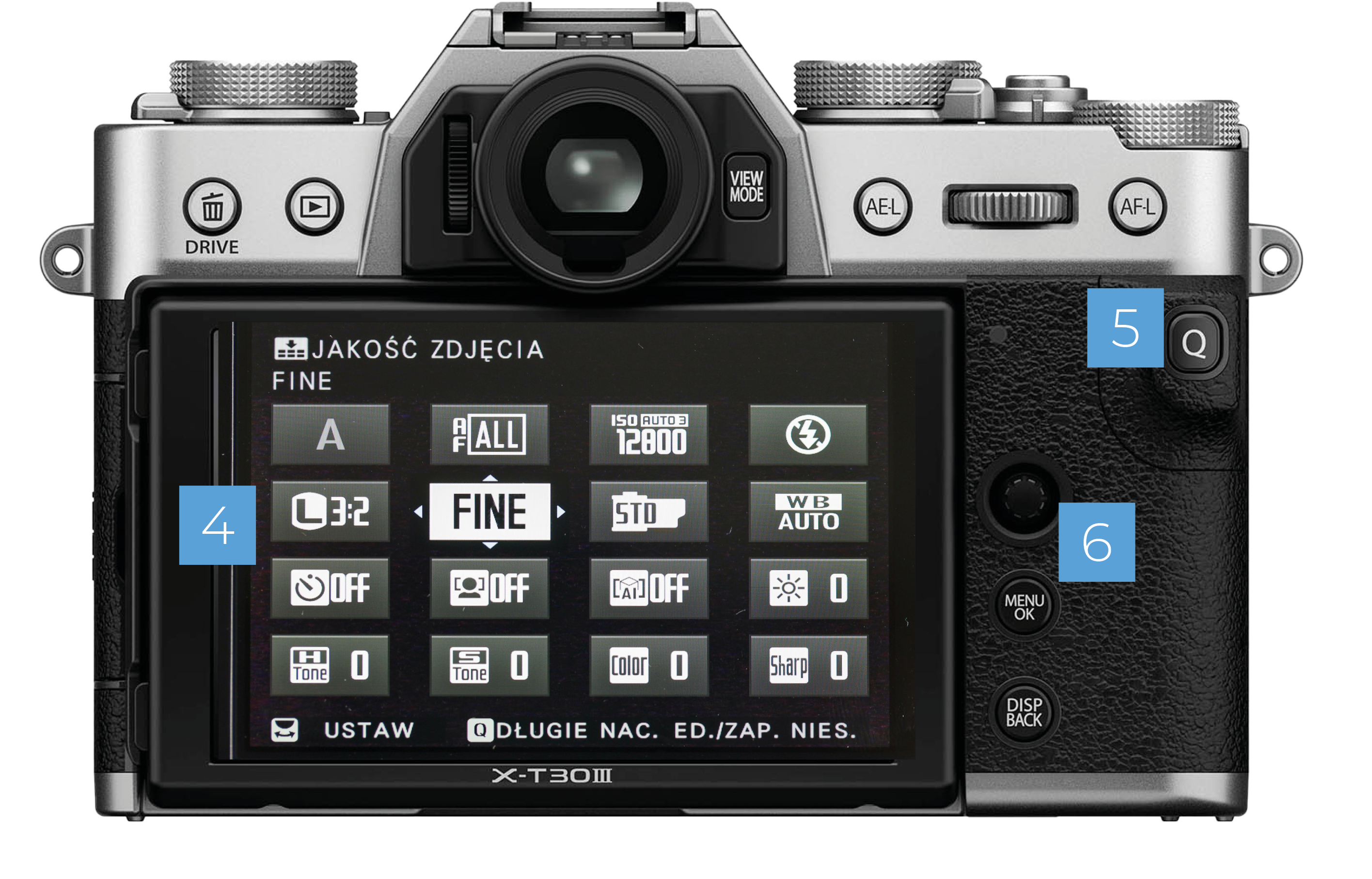 Przycisk Q umieszczony wygodnie pod kciukiem daje szybki dostęp do najczęściej używanych ustawień. Możemy je samodzielnie skomponować w menu głównym.