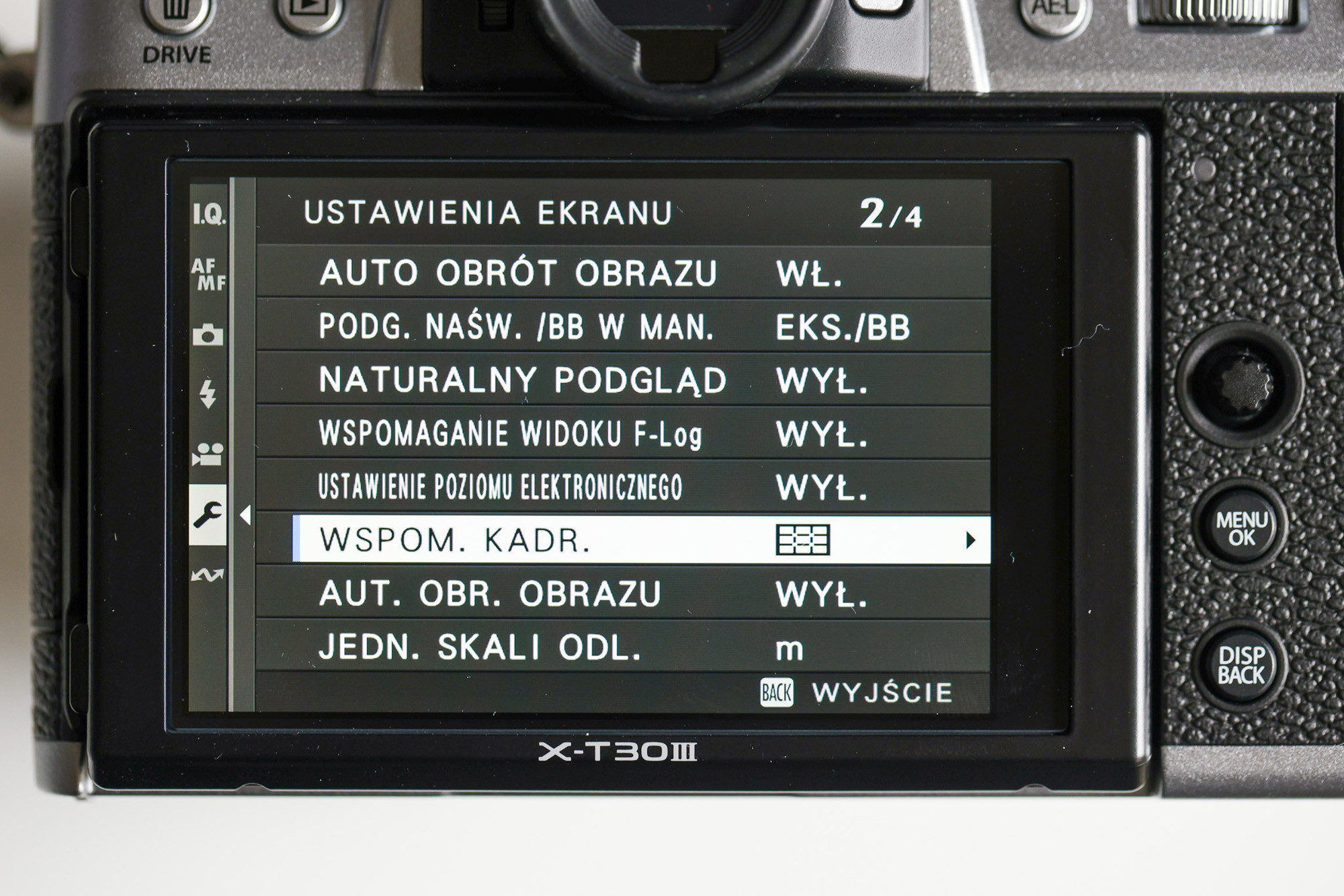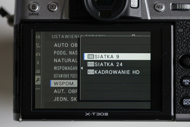 Odszukaj w menu aparatu opcję Wyświetlanie siatki. Na przykład w Fujifilm X-T30 III znajduje się ona w menu ustawień ekranu.