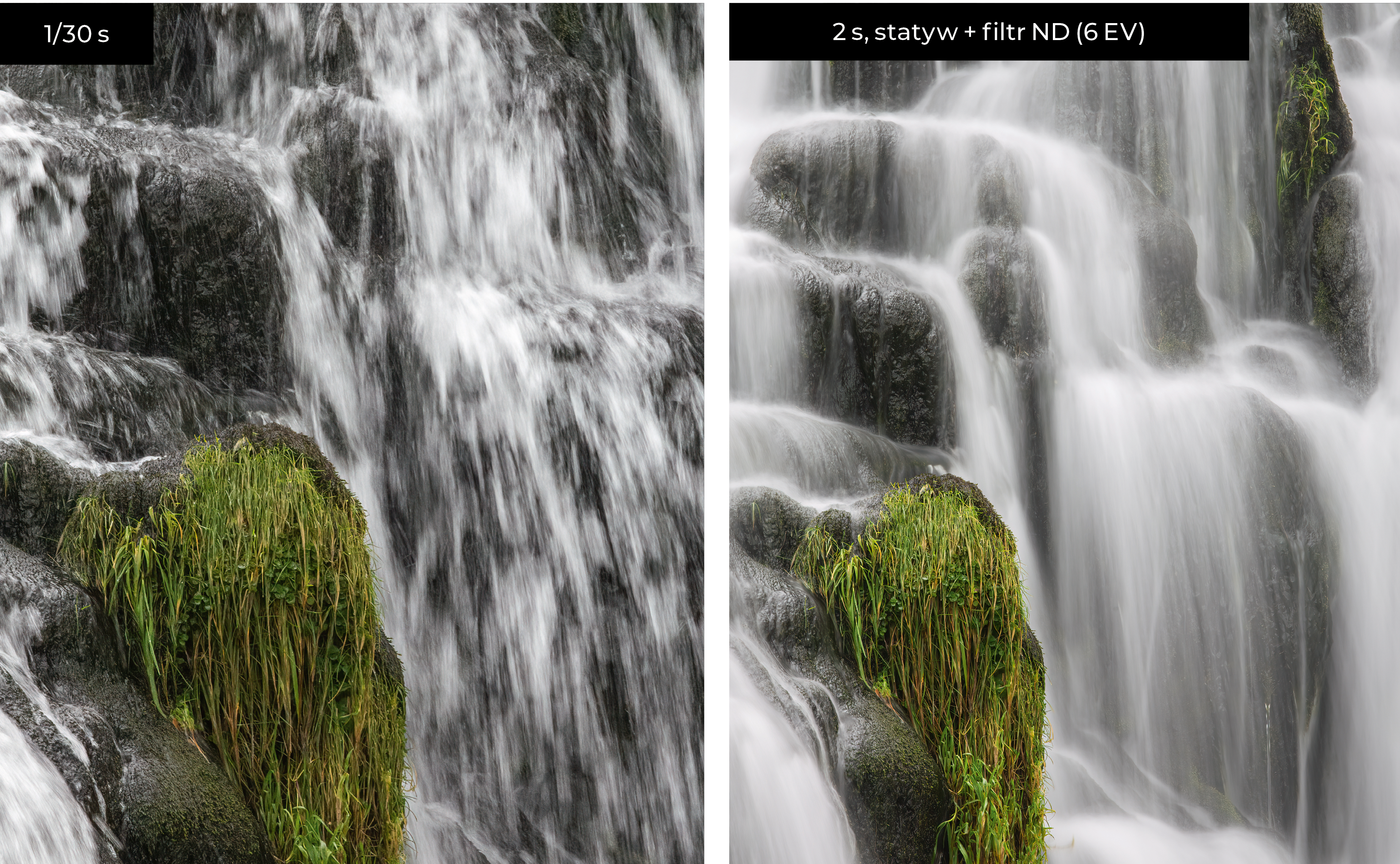 Uchwyć ruch wody w miękkim, „jedwabistym” rozmyciu, używając długich czasów naświetlania, np. od 1/4 do 2 s, i korzystając ze statywu. Idealnymi motywami są wodospady, strumienie, fontanny, a nawet zwykły kran w ogrodzie! Eksperymentuj z różnymi czasami, by kontrolować to jak gładka staje się woda..