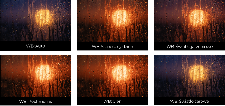 Tryb Auto WB zazwyczaj dobrze radzi sobie z kompensacją różnych temperatur światła, choć czasem może zniwelować nastrój sceny, który chciałeś zachować. Jeśli więc korzystasz z automatyki, zastanów się, czy jej decyzja rzeczywiście wspiera Twoją kreatywną intencję. Na poniższym przykładzie widać, jak różne ustawienia wpływają na kolory zachodzącego słońca sfotografowanego przez mokrą szybę.