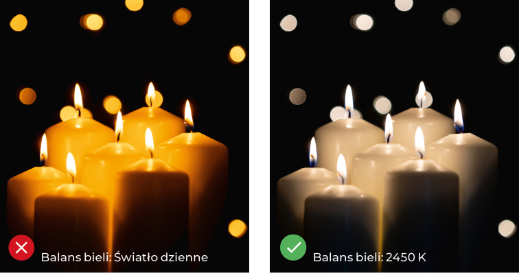 Pobaw się balansem bieli, żeby uzyskać różne efekty. Na przykład ustawienie Światło dzienne przy świetle świec da ciepłe, nastrojowe ujęcie, podczas gdy własny, ręcznie ustawiony balans bieli z temperaturą około 2450 K może sprawić, że scena będzie wyglądała neutralnie. Żadne z tych ustawień nie jest „błędne” - to po prostu kwestia kreatywnego efektu jaki chcesz osiągnąć.